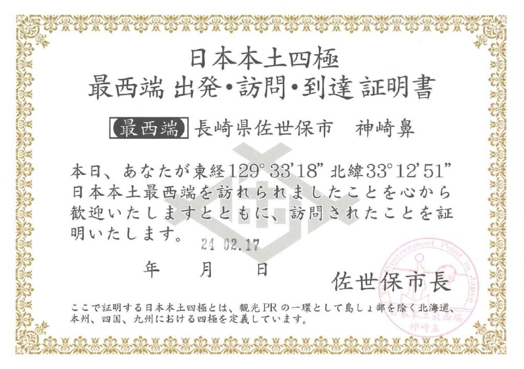 最東端到達から4年の時を経て2024年2月17日に到着。最西端の読みは「こうざきばな」と唯一岬を名乗っていない。対岸に島を望むため端っこに到達した感が若干薄め。沖には車でも徒歩でも行ける平戸市の平戸島が見えているがこれは離島扱い。「本土四極」の意味を改めて実感するのも一興かもしれない。