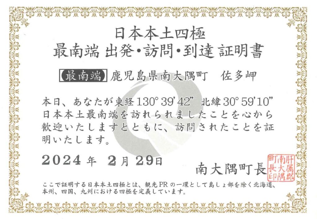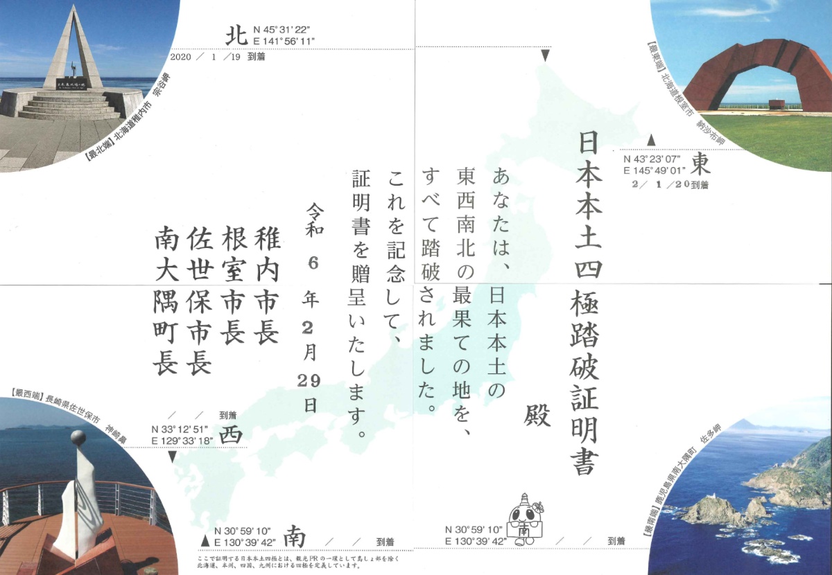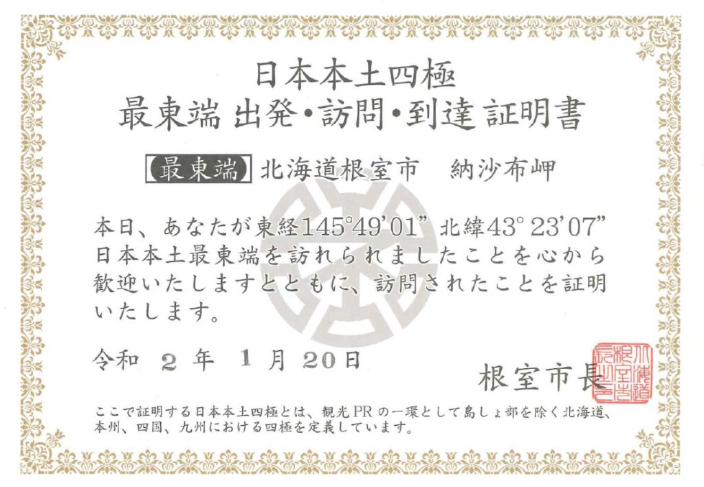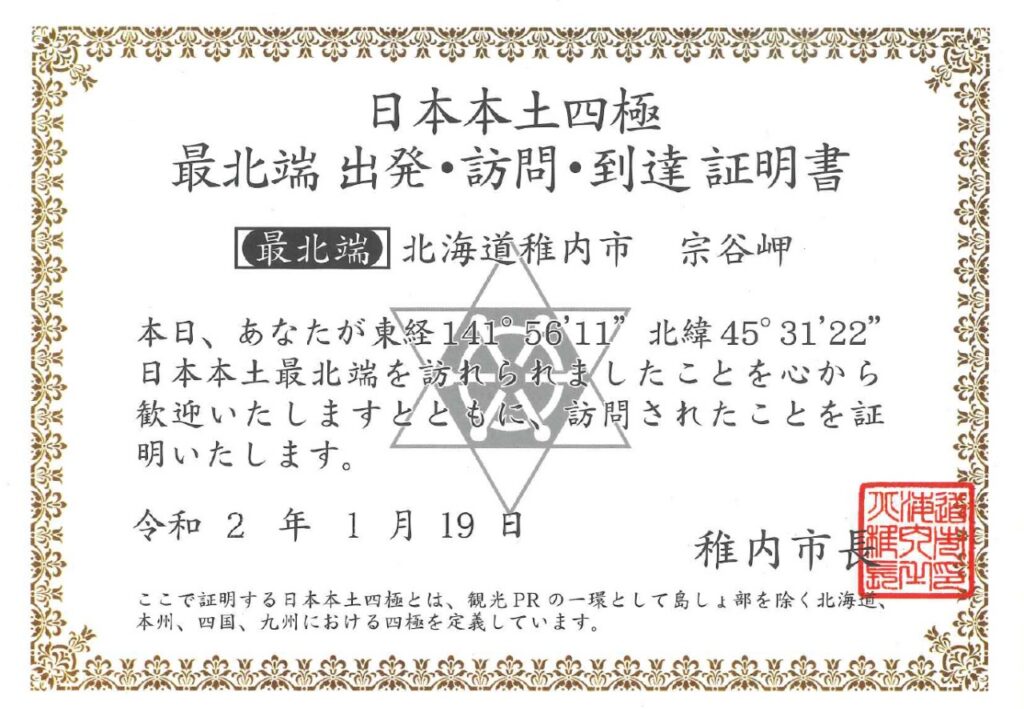 そんなわたしが今回オススメするのは2年前に達成した「日本本土四極到達証明書」を目指す旅です。地元の鹿児島をスタート地点と考えたら北海道の2か所と長崎県の1か所の計3か所を旅の経由地に追加すると達成可能です。とはいえ、物理的に端に存在するため経由ではなくそれを目的に頑張って行かないといけないというのはちょっとハードルが高いかもしれません。わたしの到達の記録を以下にまとめて、それぞれのコメントを述べていきます。